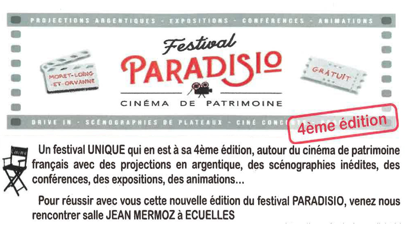 Pour la première fois, le Festival du Cinéma Paradisio s’installe à Moret-Loing-et-Orvanne du 27 au 29 août. Entre nature et culture, Moret-sur-Loing qui s’enorgueillit déjà d’un riche passé cinématographique, constituera pendant ces trois jours, un écrin naturel à tous les amoureux de patrimoine et de 7ème art.